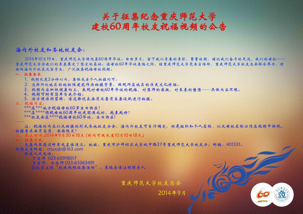 10月征集重庆师范大学60周年校庆校友祝福视频公告