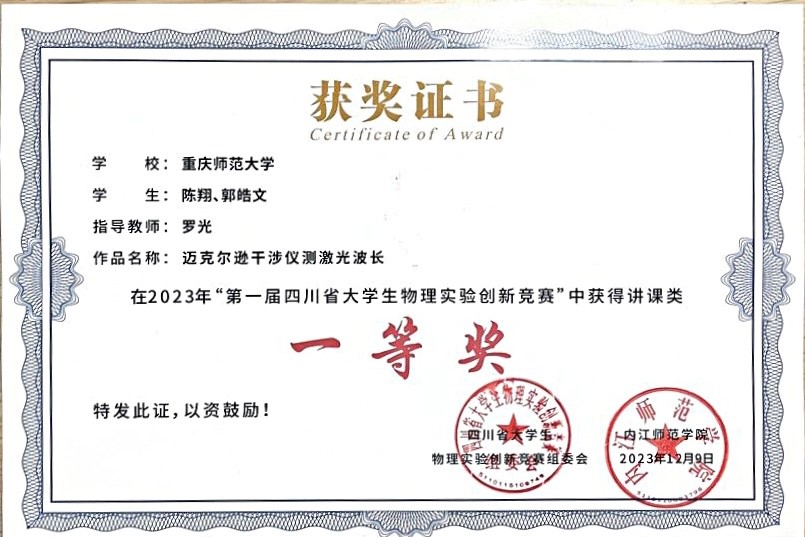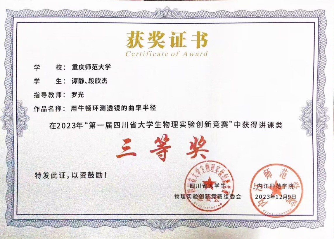 本次竞赛由四川省教育厅主办,内江师范学院承办,内江科学技术协会、内江市物理学会协办,来自川渝地区16所高校共59支代表队参赛。竞赛分为命题类、自选类和讲课类三类。物电学院两支代表队(2021级物理学陈翔和郭皓文组成1队、2022级物理学谭静和段欣杰组成2队)参加讲课类竞赛,分为讲课环节和答辩环节。讲课环节限时20分钟,答辩环节接受评委提问,内容包括实验理论、实验过程等,答辩限时5分钟。陈翔和郭皓文团队以讲课类第一名获得一等奖,谭静和段欣杰获得三等奖。