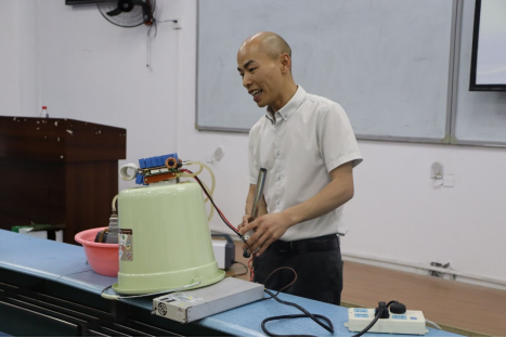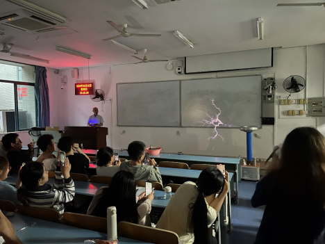 屈川老师从教期间一直致力于物理创新实验开发和研究,制作大型特斯拉线圈、范德格拉夫起电机、轨道电磁炮、雅各布天体等各类实验教具近百件,开发设计“实验让课堂更有温度”系列课程,新颖的教学方式先后被新华社、人民日报等媒体报道。屈老师在讲座中分享了物理实验教具制作的经验,并将自制的部分实验教具带到讲座现场为物电学子进行展示,音乐特斯拉线圈、电磁炮实验、反冲小车实验、自制汽笛、安全用电实验……新颖的实验设计和意想不到的实验结果吸引了众多同学的目光,讲座现场惊叹声不断。