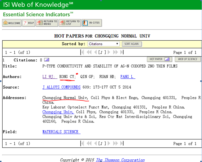 据美国科技信息所(ISI)基本科学指标数据库(EssentialScience Indicators,简称ESI)于2015年3月最新统计数据显示,我院孔春阳教授课题组和重庆大学合作,以我院为第一单位于2014年发表在《JOURNALOF ALLOYS AND COMPOUNDS》上的学术论文《P TYPECONDUCTIVITY AND STABILITY OF AG-N CODOPED ZNO THIN FILMS》入选ESI热点论文(ESIHot Papers),标志我院在该领域研究已引起了国际同行的广泛关注,对于不断提升我院的学术声誉,扩大我院学科的影响力具有重要意义。