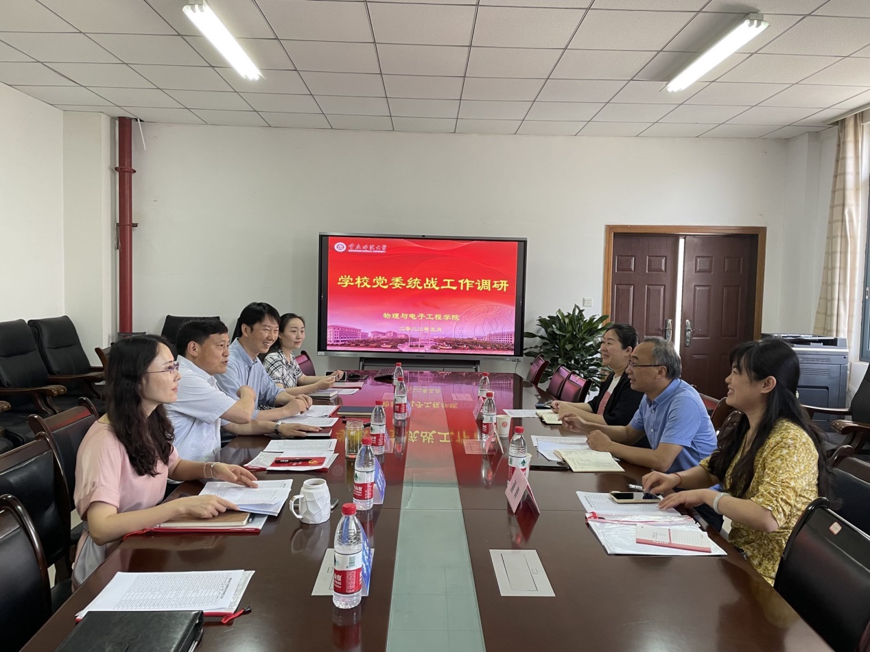 5月31日学校党委统战部部长刘军、民主党派科科长董青和吴阳红一行来我院进行统战工作调研,学院党委书记杨云,副院长(主持工作)余鹏、张丁可,党委副书记曾艳和办公室主任辜永红等参加了调研会。