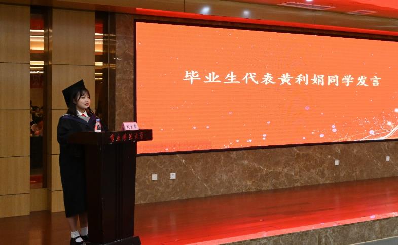 毕业生代表黄丽娟同学发言。她表达了对学校、学院的感恩,对同窗的不舍和对未来的期望,讲出了毕业生们的心声。