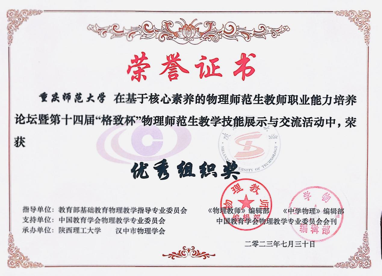 7月28日至30日,由教育部基础教育物理教学指导专业委员会、中国教育学会物理教学专业委员会与《物理教师》和《中学物理》杂志编辑部联合主办的第十四届“格致杯”全国物理师范生教学技能展示与交流活动在陕西理工大学落下帷幕。本次比赛,采用线上与线下结合的方式,进行分组展示。PA视讯本科生和研究生共有9名同学参加教学展示、2组自制教具展示和2组论文展示。在物理教育学团队的精心指导下,他们取得了一等奖4项、二等奖4项、三等奖5项的好成绩,学院获得优秀组织奖(详见下表)。