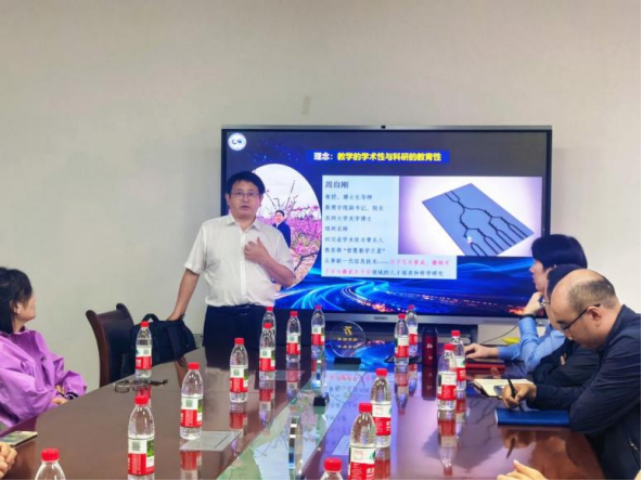 周自刚教授以“项目驱动支架式教学设计创新——以《光电创新创业教育》为例”为主题,深入浅出地介绍了该领域的前沿动态和发展趋势。他结合自身丰富的科研实践,通过生动案例与详实数据,将复杂专业知识讲解得清晰透彻。从理论构建到应用拓展,周教授的讲述层层递进,为在场师生带来一场内容丰富、视野开阔的学术盛宴。在讲解过程中,周教授还特别注重与师生的互动交流。他鼓励大家积极提问,对于每一个问题都耐心细致地解答,并引导大家从不同的角度思考问题。现场气氛热烈,师生们纷纷就自己感兴趣的话题与周教授展开深入讨论。