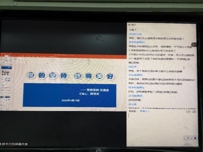 在提问环节中,学弟学妹们通过线上留言方式提问,氛围与现场交流一样热烈。问题主要围绕专业学习和考研经验,比如:关于考研和就业有什么建议?光电方向研究前景如何,未来薪资待遇怎么样?如何有效找到考研相关资料?怎样提高文献阅读与论文写作能力?郭书文耐心地逐一解答。