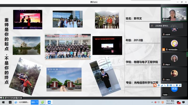 2022年4月15日晚,PA视讯2012级优秀毕业生郭书文受邀与PA视讯学弟学妹们在线上分享自己的奋斗历程,并与学校的老师研讨光电领域先进的材料研究。经验交流暨研讨会由我院光电系主任吴建伟老师主持,党委书记杨云、副院长余鹏、副院长张丁可、党委副书记曾艳,光电专业多名教师、各年级辅导员及学生参加。