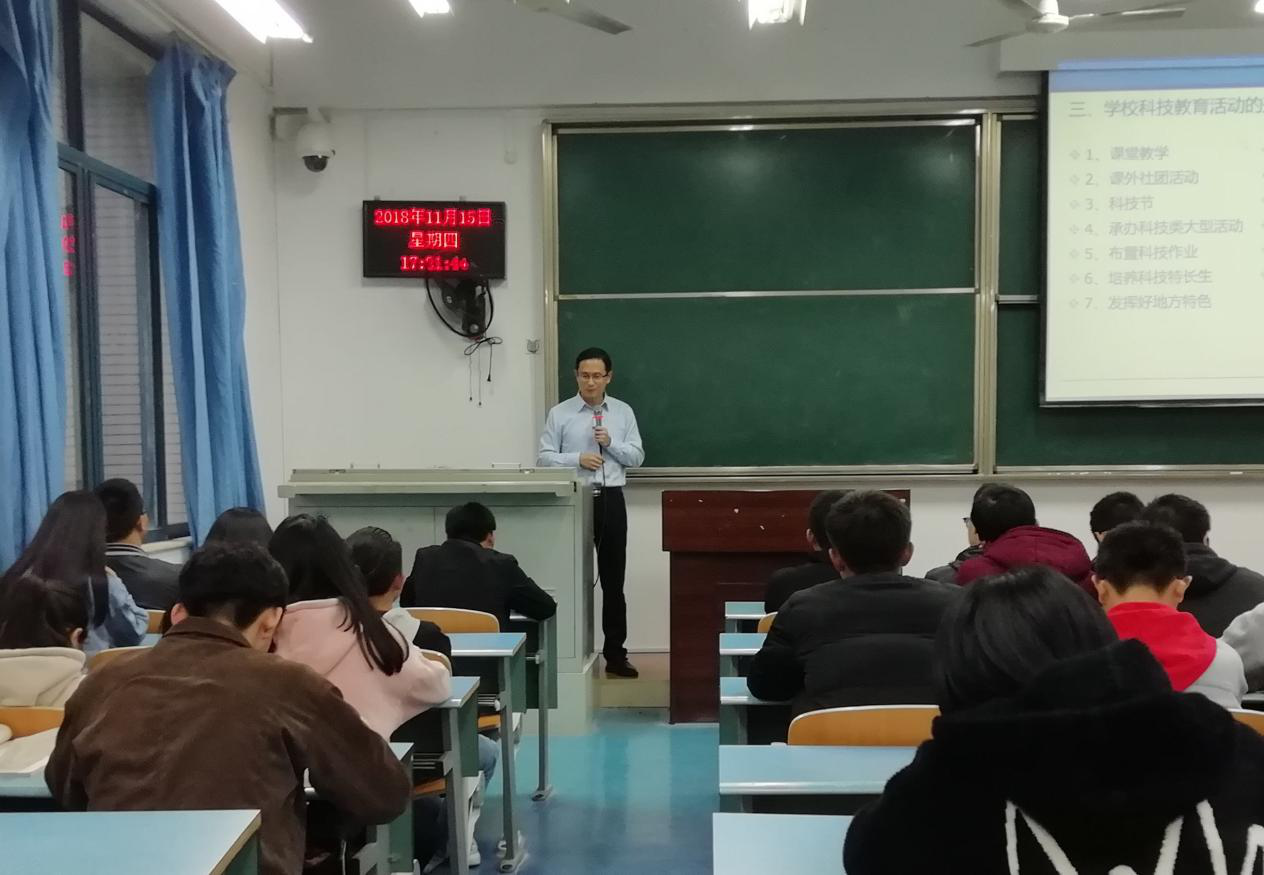 其次是科技教育的任务为普及科学知识、倡导科学方法、传播科学思想、弘扬科学精神。最后一点则是学校科技教育活动的任务——传授科技知识、训练技术技能、掌握科技方法、提高创造能力。刘校长借自身经历、所见所闻,深刻剖析了当今的社会状况,帮助同学们更好的了解了从事科技教育活动这一工作的具体内容。在此基础上,刘校长从学校、家庭、制度等几个方面具体的向同学们展示了学校科技教育活动的开展的13种形式。讲座最后,刘校长表达了对同学们能够从事科技教育者的殷切希望。