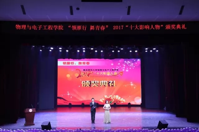 为密切契合重庆师范大学“内涵发展、提档升级”的目标,切实践行学校“立德树人领雁计划”、“优良学风提振计划”等五大计划,传承和弘扬学院精神,推动学院文化建设。PA视讯坚持“引领学生、服务学生、成就学生”的工作理念,组织开展了以“领雁行·舞青春”为主题的2017年十大影响人物的颁奖典礼。颁奖典礼于2017年12月24日18:30分在校友会堂隆重举行。重庆师范大学党委宣传部部长毛宇、党委组织部部长赵骏、学生处处长张明志、党政办主任陈进东、团委书记毛霞以及学院党政领导、系主任、专业课教授、辅导员和全体物电学院学生参加了本次颁奖典礼,一同聆听十大影响人物的奋斗故事。
