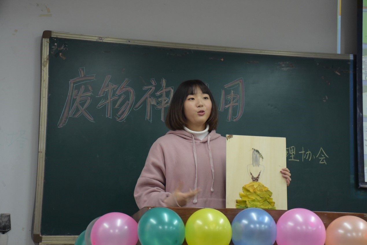 灵感来源于生活,平时作为垃圾的快递盒、塑料瓶、鸡蛋壳…甚至是一小块石头、一片落叶都能成为你作品的原材料,经过改造,这些材料变废为宝,减少麻烦的同时又给我们带来了方便。树上的落叶经过一双巧手的制作竟化为一袭美丽的长裙。一个个干松果经过上色晾干转身变成各色的花朵,再经过固定,一盆漂亮的盆栽就制成了。还有那来自于秋天萧瑟的枯枝与折好的花朵一起制成的相框,枯木逢春,如梦初醒。双十一之后,大量的快递盒子无处安放,有人把它改装成房子给流浪猫一个温暖的窝;有人将它改装制成鞋盒或是收纳盒;有人结合专业知识(物理学)与较强的动手能力,用转盘轮滑连带效应的原理,用三个转动的圆盘实现三位密码锁的设定,制成环保密码锁;还有人将它改造成一个蛋糕献给自己的父亲,里面装着满满的爱。冬天来了,为了做作业时脚不会冻冷,一小组利用纸板制作了一张桌子以便在床上使用…作品展示之后,便是节目表演,游戏环节,大家踊跃参加,最后公布获奖名单,获奖小组上台领取奖品并合照。
