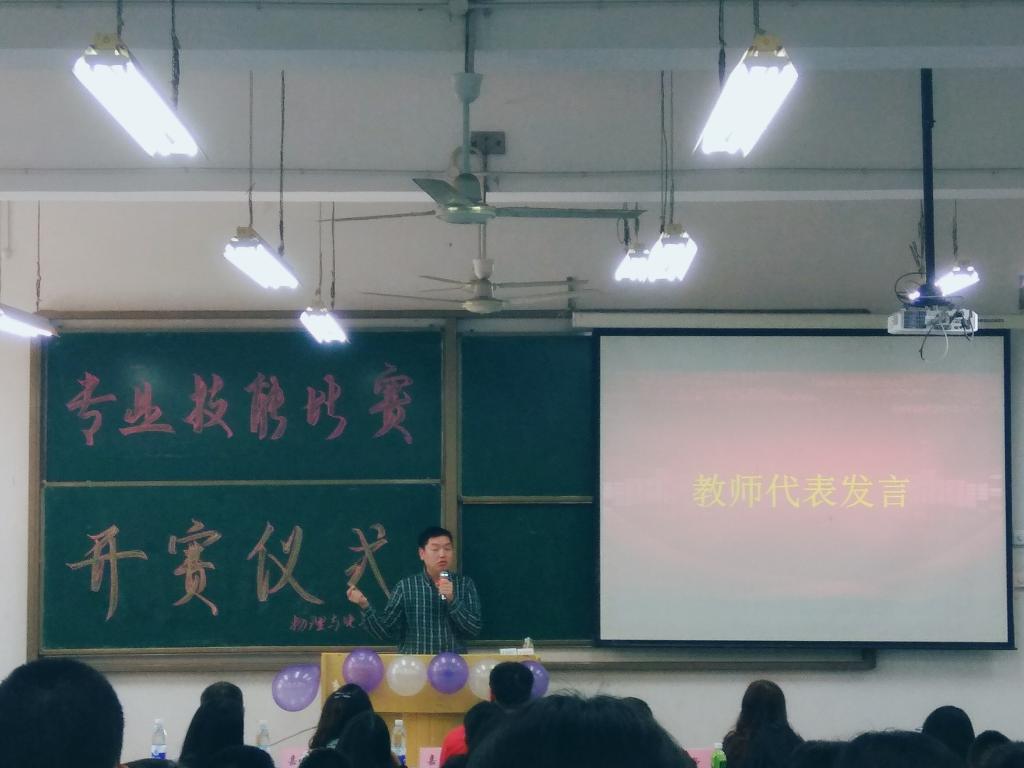 专业技能竞赛开赛仪式在同学们的强烈期待下如期而至,同学们的参赛热情顿时高涨。为了进一步强化学生专业技能训练,提高学生实践能力、创新能力,提高我院学生专业技能水平和动手实践能力,丰富比赛经验,为今后每位学子的就业打下良好基础,促使同学以最好的状态迎接大赛的到来,增强同学们的自信心,2017年11月3日下午一点,物理与电子工程院学生会科技部、学习部于弘德楼15104开展专业技能竞赛开赛仪式。邀请各专业老师为参赛同学现场指导,从而帮助同学们整理思路,积极备战。到场嘉宾有专业技能竞赛指导老师罗光老师、张丁可老师、范嗣强老师,团总支书记兼学工办主任李青松老师和全体辅导员,以及非师范生学生代表石林,师范生学生代表唐越。