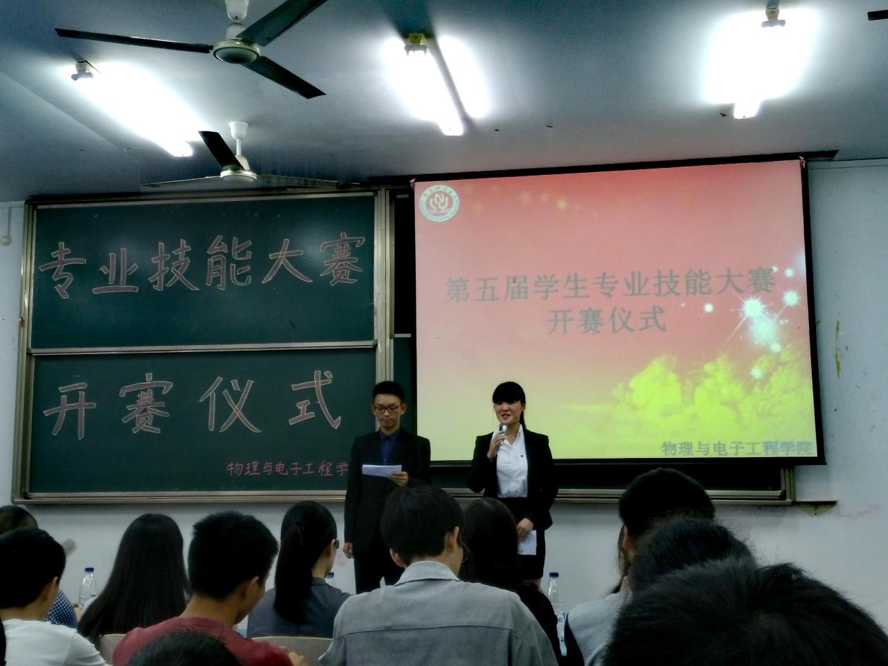 由重庆师范大学PA视讯学习部与科技部联合举办的第五届学生专业技能大赛开赛仪式于2016年10月21日下午,在弘德楼15202教室圆满落幕。学院领导对此次专业技能比赛十分重视,光电系主任张丁可教授、电子系主任罗海军老师、物理系副教授罗光老师、团总支书记李青松老师、辅导员余海蔚老师、陈禹辛老师、漆佳老师及往届参赛代表叶宇欣出席本次开赛仪式。物电学院全体参赛队伍代表参与活动。