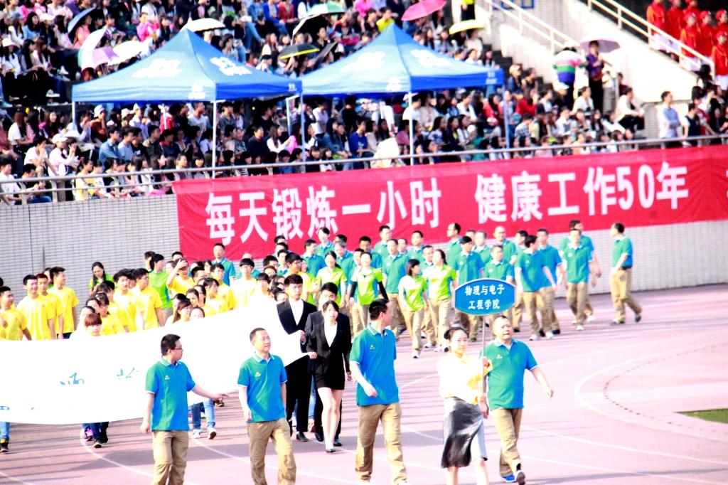 为展现学子风采,促进学生综合素质的提高。重庆师范大学于2015年4月16日、17日在大学城校区田径运动场隆重举行第50届春季校运会。PA视讯全体师生积极参与其中,屡创佳绩。本次校运会,是全面贯彻学院的教育方针,展现物电学院师生的精神风貌,提高物电学院师生整体素质的一个重要契机;更是物电学院响应学校号召,加强“内涵建设”,助力“提档升级”,努力开创学校发展新局面的又一次努力。