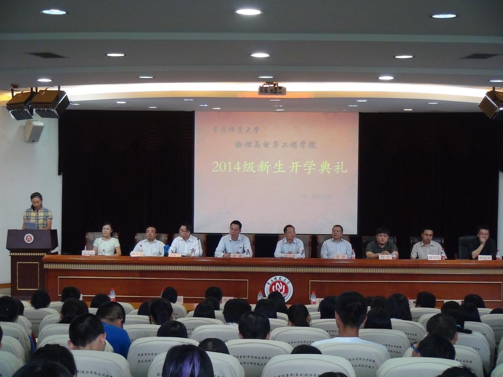 一段洋溢着年轻气息的视频——《青春在这儿》拉开了开学典礼的序幕,14级新生在一个个真实的镜头中提前感知丰富多彩的象牙塔生活。视频结束后,院长崔玉亭围绕“学院专业教学方针”为物电大家庭的“新成员”们简单介绍了学院教学设施与师资力量的建设问题,强调了学院优秀人才培养模式的创新性,同时,崔院长鼓励广大新生传承物电学院开拓进取的拼搏精神,做到物电学院共同成长,用实际能力续写物电的辉煌。然后,教师代表张丁可结合自己在重师物电的个人发展历程,将学院新兴专业——光电信息科学与工程发展做了一一介绍,同学们对学院专业老师的教学理念有了初步的了解。让接着,高年级学生代表代悦婷走上台传播正能量,她结合自己大学两年以来的成长经历书写出青春不悔的誓言——鼓励低年级学生勤奋学习、全面发展。最后,新生代表王兰若用坚定的言词表达出所有初到象牙塔的同学们勇往直前、追求上进的决心。