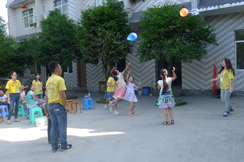 承载彼此梦想的气球在院坝上空飘荡,孩子们的欢声笑语打破乡间清晨的寂静。一颗气球就是最好的玩具,撑起了童年最幸福的时光。志愿者们寓教于乐,通过简单的抬气球游戏将小朋友们聚集到一起,让大家在欢乐的游戏时光体会“团结合作,凝聚力量”的重要性。