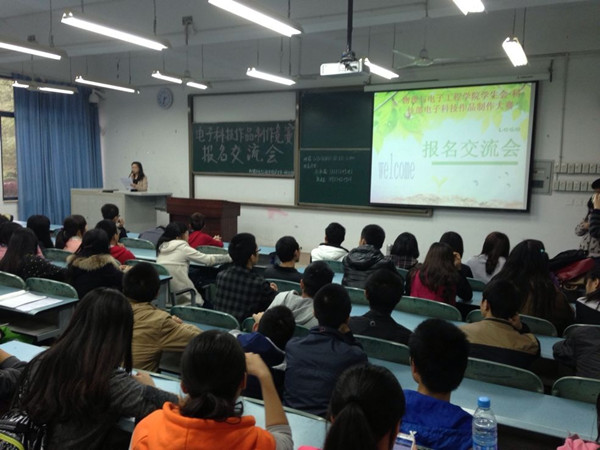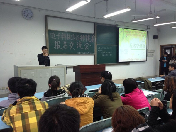 交流会现场,首先由主持人介绍本次活动到场的嘉宾。随后,物电学院学生会主席丛天雷上台与大家分享他曾经参加电子科技作品制作竞赛的经验、体悟,并鼓励大家积极参加诸如此类对创新思维能力提高有所帮助的竞赛。他说,这些以动手能力为主的竞赛持续时间较长、但只要同学们懂得坚持与合作,最后将会取得圆满的成功。接着,由物电学院学生会科技部部长石可嘉做交流。她对今天嘉宾及所有同学的到场表示感谢,然后以一位曾经获奖的高年级同学的参赛经历为例指出参加电子科技作品制作竞赛是一个很好的学习机会,无论是在专业知识方面还是在社会活动时间方面,诸多能力都会得到提升,但是大家在比赛中要注意避免产生头重脚轻式的项目开发,即有能力的同学面面俱到,能力较差的同学无事可做。然后,科技部副部长向承琼介绍了电子科技作品制作竞赛的大体流程:初步组队报名、专业老师指导课题选择、作品模板成型、评审组的最终评定。据悉,比赛时间会持续到下学期截止,而参赛者在本学期的主要工作是完成课题的选定。最后,同学们开始进行现场自由交流、组队、提交报名表,现场一片火热。