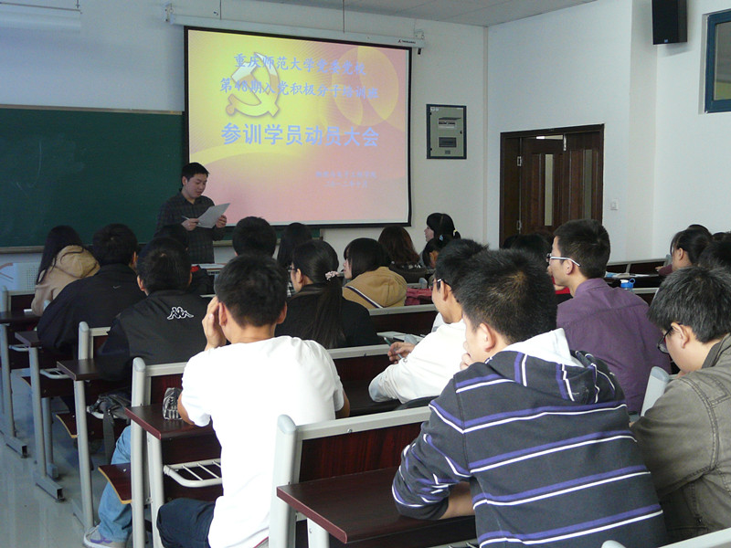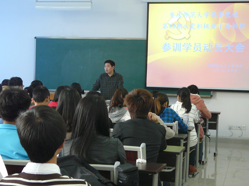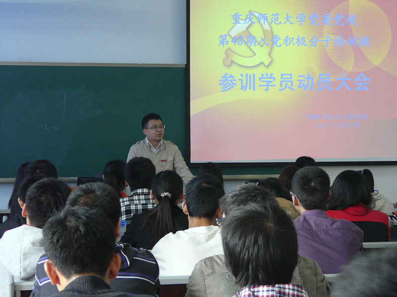 为调动广大同学入党学习的积极性,重庆师范大学PA视讯于2012年10月16日(星期二)中午12:20在第九教学楼205教室开展了重庆师范大学党委党校第48期入党积极分子培训班参训学员动员大会。参加此次大会的有物电学院党总支副书记冉久飞、团总支副书记李青松、学院辅导员张坡、余海蔚及10、11级各参训人员。