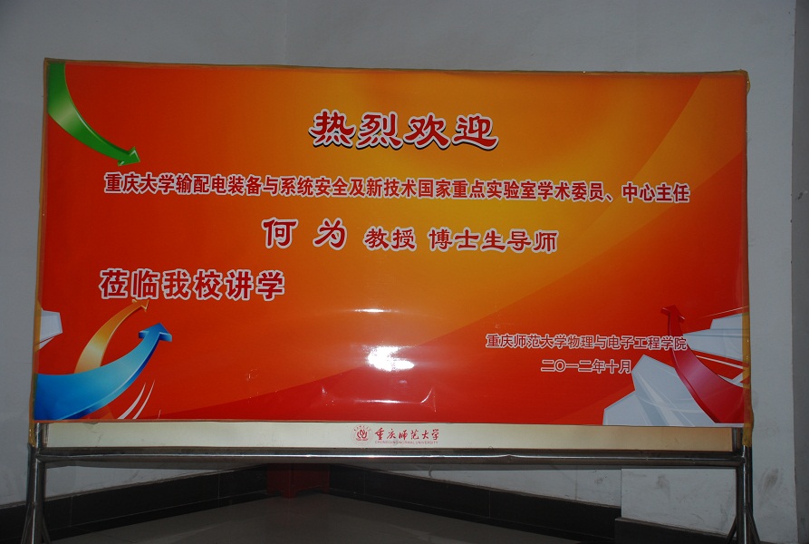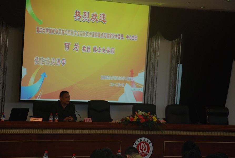 2012年10月11日星期四下午14:30,重庆师范大学PA视讯邀请了重庆大学输配电装备与系统安全及新技术国家重点实验室学术委员中心何为教授在凯撒报告厅举办了一场关于“电工新技术发展及其应用”的专题讲座,参加这次讲座的嘉宾有物电学院党总支副书记冉久飞、团总支副书记李青松以及2012级电子专业的新生。