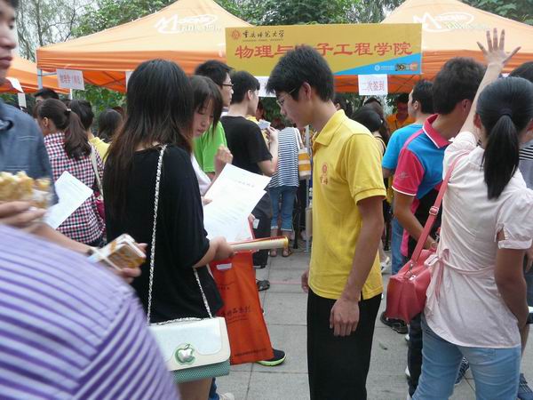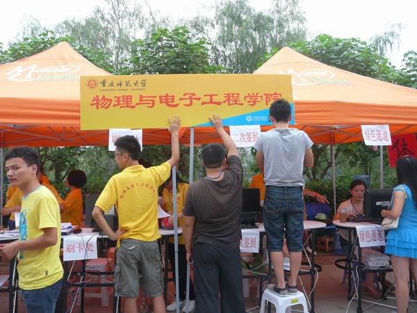 重庆师范大学PA视讯于2012年9月8日上午8点展开了第二天的迎接新生工作。今日的迎新工作由物电学院团总支学生会的全体成员以及2011级物理学、2010级电子信息科学与技术的志愿者参加。