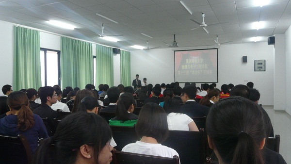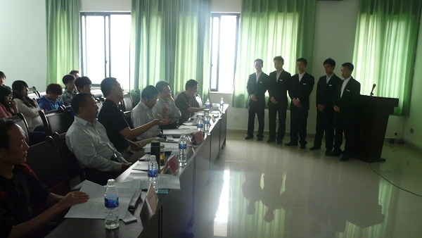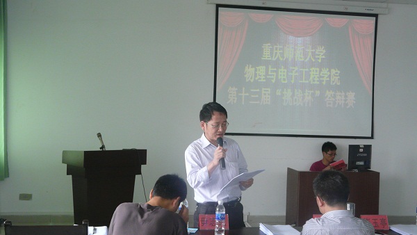 2012年5月27日上午8:30,重庆师范大学PA视讯第13届大学生“挑战杯”答辩评审在第二实验楼501举行。参加本次答辩评审的的老师有主持学院工作的副院长崔玉亭教授、党总支书记唐敏,党总支副书记冉久飞、团总支副书记李青松、苑进社教授、毋志民副教授和宋培森副教授。各位老师严肃认真地对待每个项目陈述和答辩,取得了很好的效果。