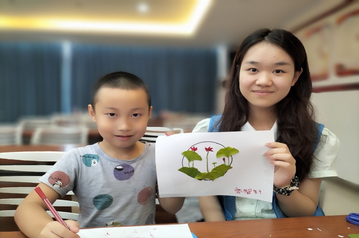 图为志愿者和小朋友一起制作的树叶贴画。 邓文孟 摄