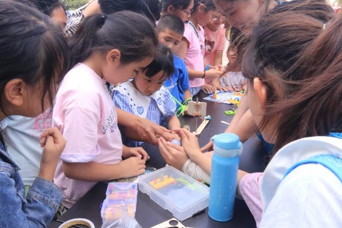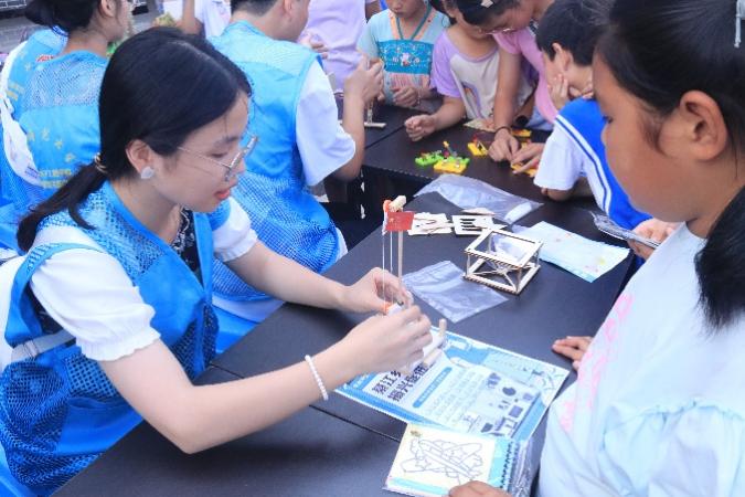 图为实践队员为小朋友讲解“升国旗装置”中,定滑轮与动滑轮的区别。中国青年网通讯员 周江 供图