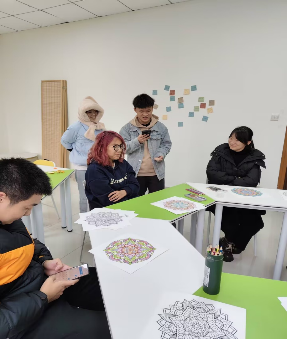随后,活动进入了曼陀罗涂色的精彩环节。同学们围坐一堂,桌上摆满了各式各样的彩铅和洁白的画纸。伴随着轻松舒缓的音乐,同学们逐渐放松身心,全身心地投入到创作之中。他们拿起画笔,在空白的画纸上挥洒色彩,每一笔、每一划都凝聚着他们的情感与思绪。在这个过程中,同学们仿佛与曼陀罗进行了心灵的对话,将内心的喜怒哀乐通过色彩淋漓尽致地表达出来。