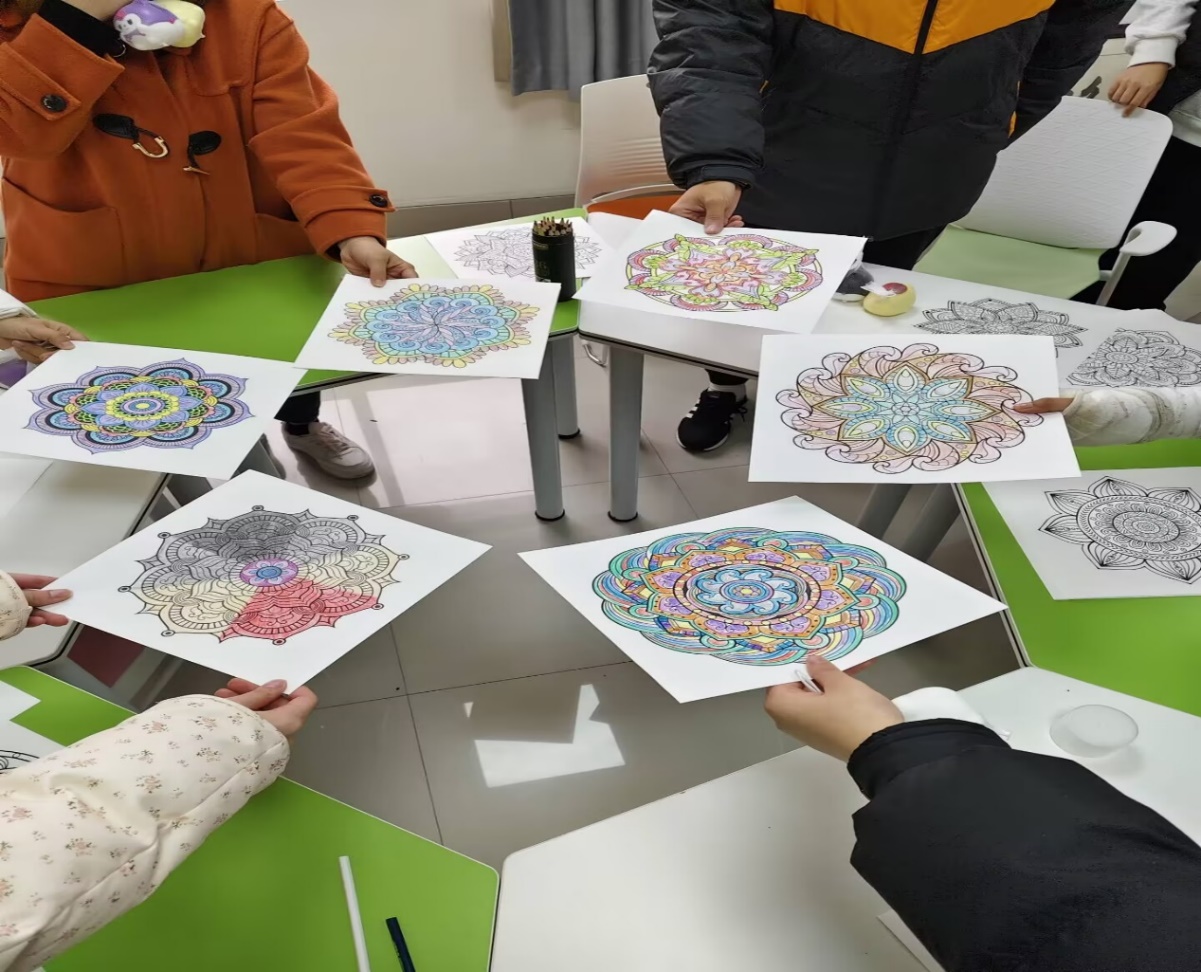 随着时间的推移,一幅幅色彩斑斓、形态各异的曼陀罗绘画作品逐渐呈现。同学们看着自己的作品,脸上洋溢着满足和自豪的笑容。他们互相欣赏作品,交流创作心得,彼此的作品成为了连接心灵的桥梁,让这个小小的活动室充满了温馨与和谐。