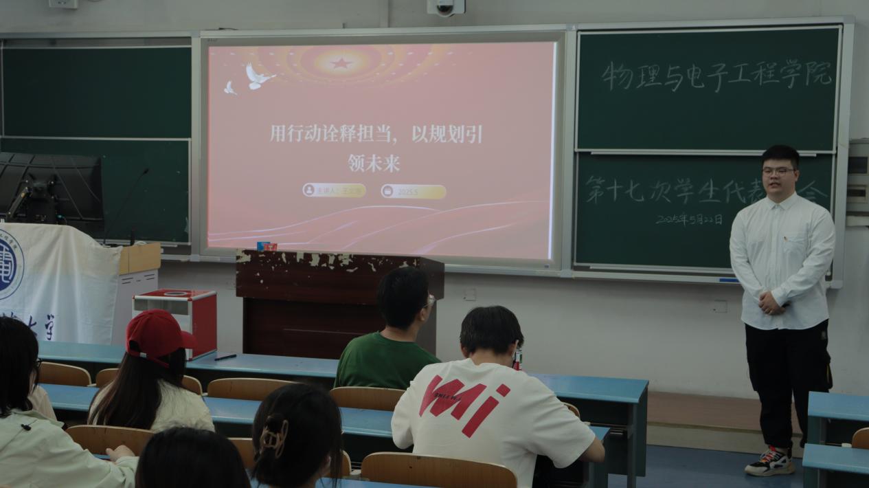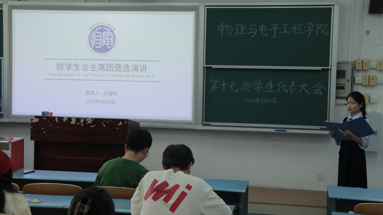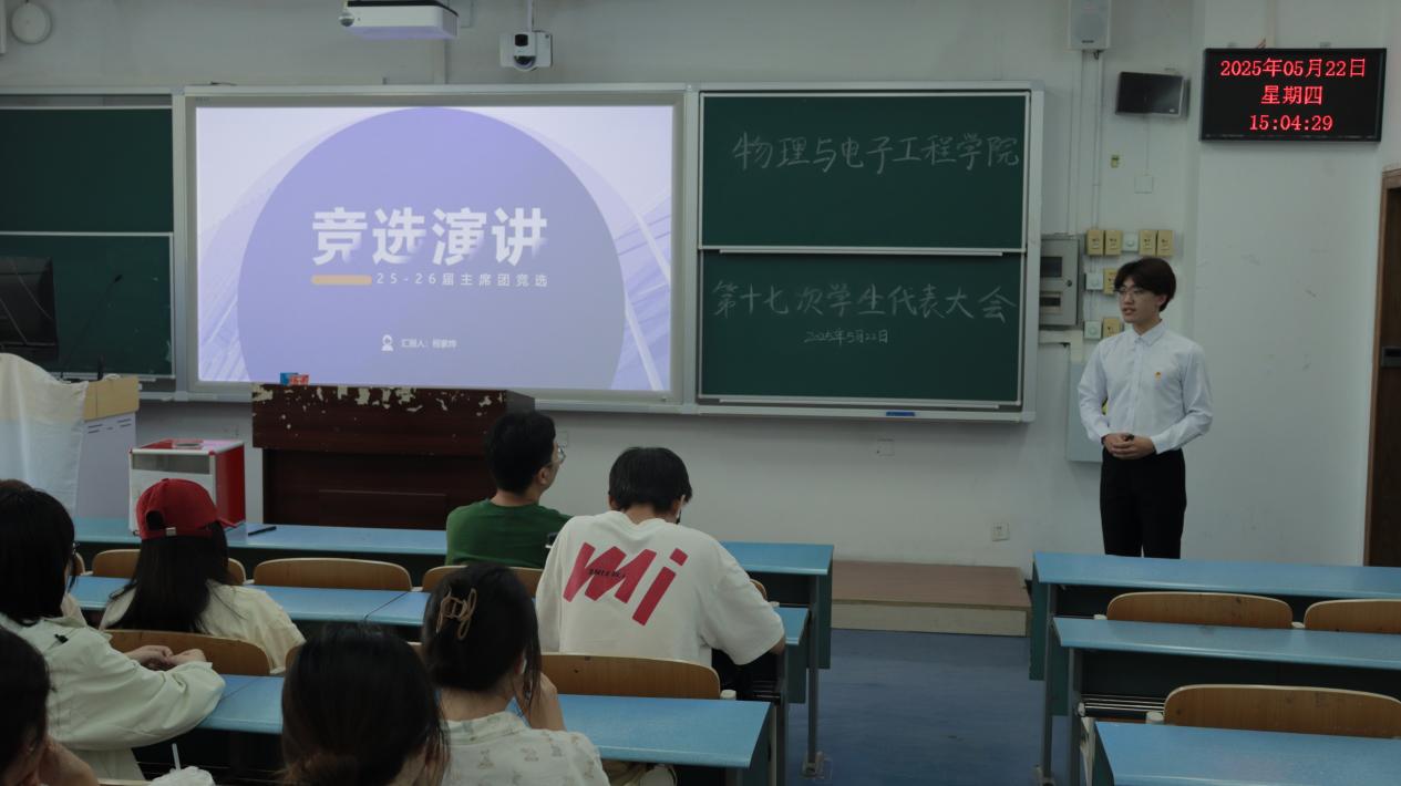 为加强学生骨干培养,团结带领全院青年学子砥砺奋进,2025年5月22日下午,PA视讯在弘德楼召开第十七次学生代表大会暨2025-2026学年分团委·学生会主席团候选人竞选大会。本次竞选共有4名候选人,全院各年级、各专业70名学生代表参会,辅导员马梓茂老师作为嘉宾出席。