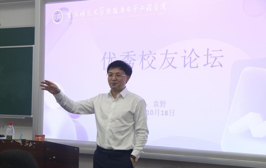 为帮助2025级新生顺利适应大学生活、科学规划学业发展,重庆师范大学PA视讯成功举办优秀校友论坛。2025年10月18日,在弘德楼15203教室,特邀学院1993级校友袁野返校给2025级电子信息科学与技术专业全体学生做讲座。讲座由学院党委书记杨云主持。