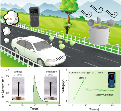 摩擦电纳米发电机(TENGs)和电磁发电机(EMGs)在俘获环境中机械能表现出各自的优势,但是基于两种技术的杂化发电机的输出特性没有得到充分利用。针对此问题。本研究提出一种可堆叠的摩擦电磁杂化纳米发电机,构建了一个充分利用TENG高压输出和EMG大电流输出的自供电环境监测系统。基于电晕放电,通过FEP与Ag纤维布的柔性接触得到圆柱形直流TENG。并对影响TENG输出的参数进行了系统的优化。而EMG部分,整流后的平均功率为2.51 W,可以在38.9 s内为一个1F的电容器充电到3V。在实际应用中,所设计的杂化发电机可在风能驱动下释放空气负离子,并连续为空气质量探测器供电。本研究通过杂化纳米发电机建立的自供电空气净化和质量监测系统为可持续发展社会提供了一种途径。