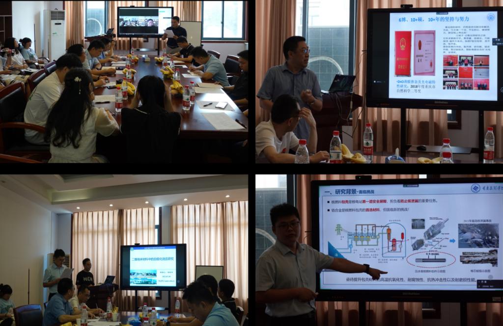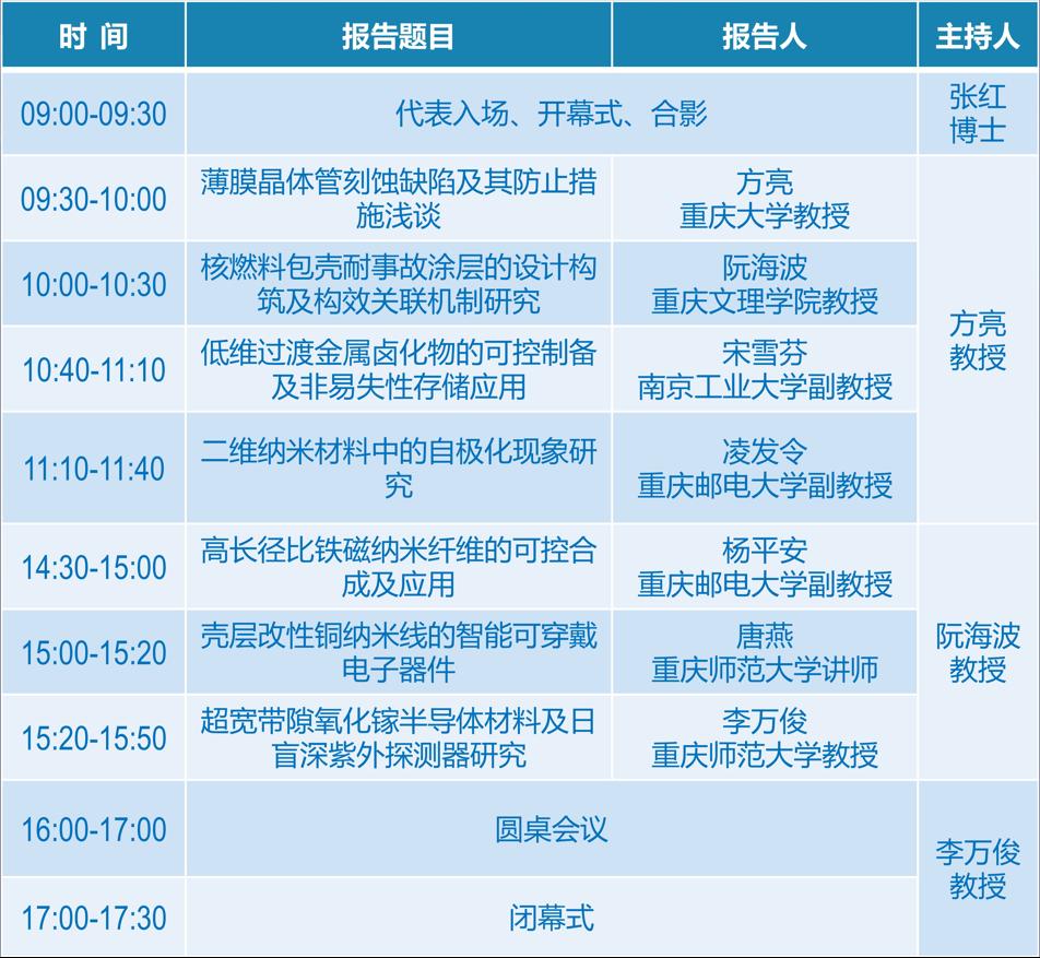 重庆大学方亮教授在报告中介绍了TFT叠层电极刻蚀缺陷的研究现状,并讨论其防止措施及相关科学问题;重庆文理学院阮海波教授以“核燃料包壳耐事故涂层问题的提出及研究现状”为题做专题报告,介绍其课题组在核燃料包壳耐事故涂层方面最新研究进展;南京工业大学的宋雪芬副教授介绍了低维过渡金属卤化物的可控制备及非易失性存储应用并分享其课题组在二维过渡金属卤化物及其在非易失性存储中的工作进展;重庆邮电大学凌发令副教授对二维纳米材料中的自极化现象对材料的电子结构、输运、表面活性等性质的影响做专题报告;重庆邮电大学杨平安副教授介绍了磁场辅助原位还原合成高长径比铁纳米线及包覆、轻质宽频带吸波涂层设计和柔性触觉传感器设计及应用;重庆师范大学物电学院李万俊教授介绍了超宽带隙氧化镓半导体材料及日盲深紫外探测器的相关研究;唐燕博士对壳层改性铜纳米线的智能可穿戴电子器件做专题报告。