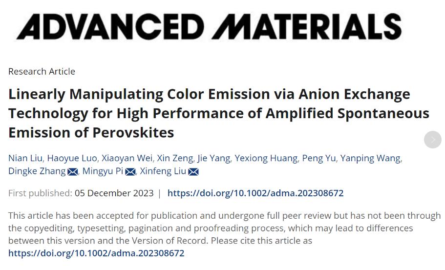 日前,重庆师范大学物理与电子工程学院张丁可教授团队在钙钛矿激光领域取得重要研究进展,以“Linearly Manipulating Color Emission via Anion Exchange Technology for High Performance of Amplified Spontaneous Emission of perovskites”为题在国际顶级学术期刊《Advanced Materials》(中科院1区,top期刊,影响因子32.086)发表研究成果。该论文第一署名单位为重庆师范大学,张丁可教授的研究生刘念为论文第一作者,重庆师范大学张丁可教授、皮明雨副教授和国家纳米中心刘新风教授为共同通讯作者。