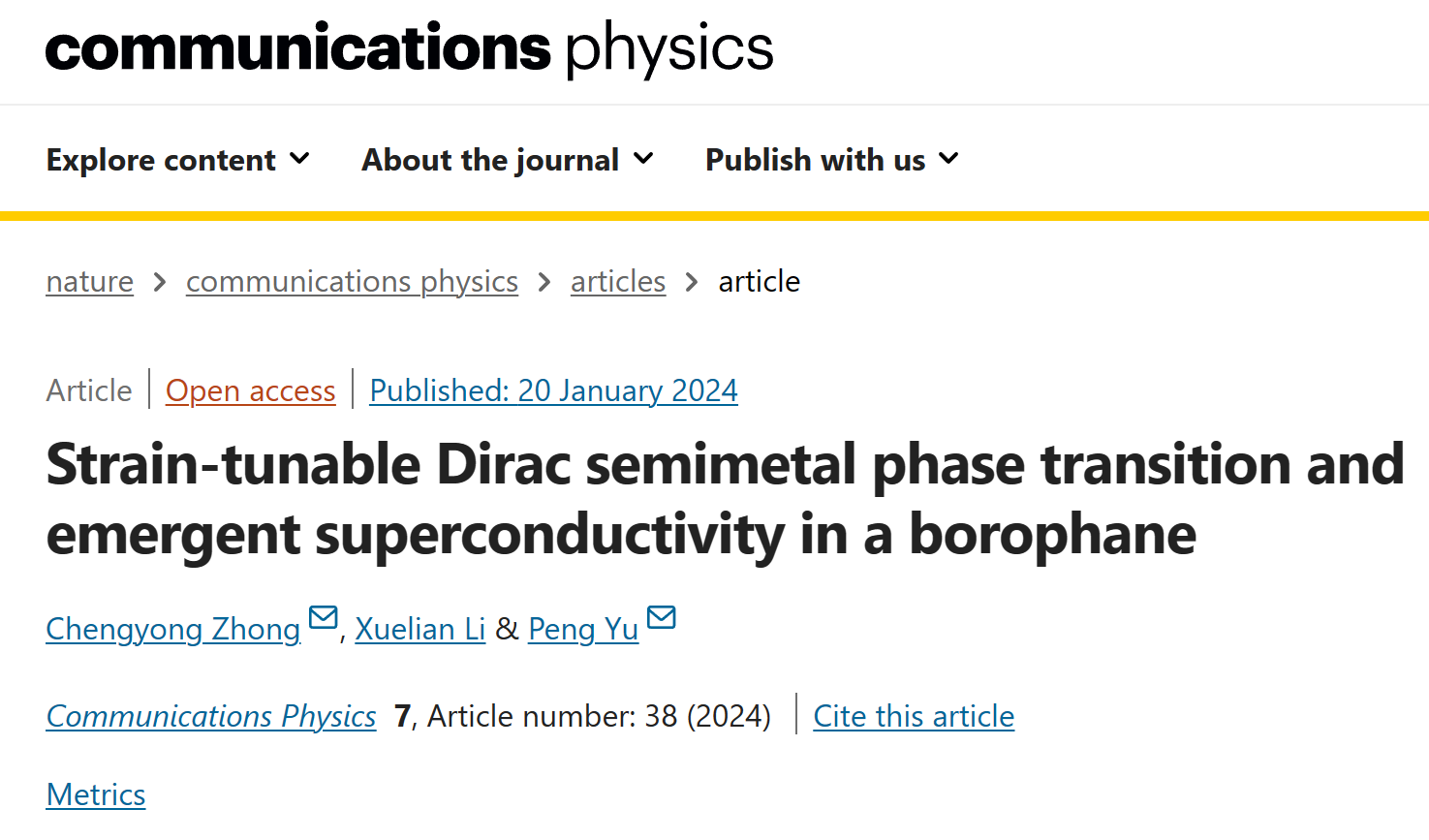 近日,PA视讯青年教师钟承勇作为第一作者和通讯作者,余鹏教授作为共同通讯作者,以重庆师范大学PA视讯为唯一单位在Nature旗下期刊《Communications Physics》(中科院物理大类一区TOP期刊)上发表题为“Strain-tunable Dirac semimetal phase transition and emergent superconductivity in a borophane”的最新研究成果。