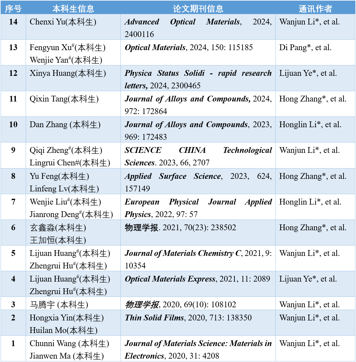 据悉,近年来宽带隙半导体材料与器件课题组在本科生学术培养方面取得一定成绩,课题组本科生在Advanced Optical Materials, Applied Surface Science、SCIENCE CHINA Technological Sciences, Journal of Alloys and Compounds, Journal of Materials Chemistry C、Thin Solid Films、Journal of Materials Science、Optical Materials Express、物理学报等国内外期刊上共发表20篇学术论文。
