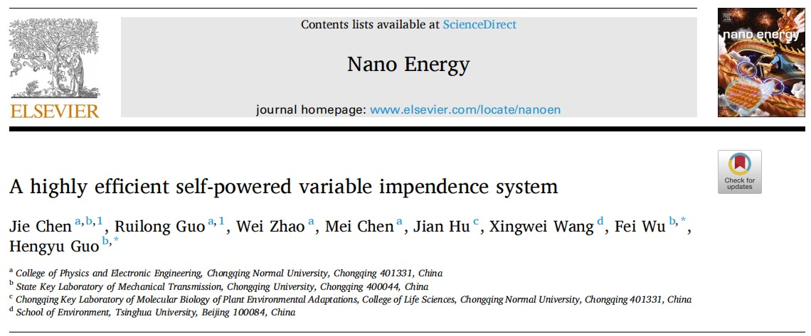 近日,重庆师范大学PA视讯陈杰副教授在微纳能源采集方面取得新进展,相关研究成果以重庆师范大学为第一署名单位,陈杰副教授、郭瑞龙(研究生)为共同第一作者,赵伟、陈美(本科生)、生命科学学院胡建老师共同贡献,在能源类TOP期刊《Nano Energy》上发表(中科院1区,影响因子16.8)上发表题为“A highly efficient self-powered variable impendence system”的学术论文。