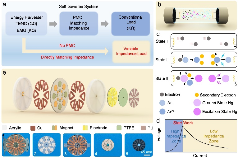 作为一种高效的机械能收集器,摩擦-电磁杂化发电机(TEHG)是自供能系统重要的组成部分。然而,摩擦纳米发电机(TENG)和电磁发电机(EMG)之间显著的阻抗差异往往会降低系统的能量利用效率。本研究创新提出一种变阻抗策略,旨在最大限度地利用TEHG转换的机械能。该方法采用阻抗从GΩ到KΩ动态变化的电子元件,直接匹配TENG和EMG的阻抗范围。实验中,以一种紫外气体放电管(UV-GDT)为例展示自供能变阻抗系统的效果。TEHG驱动UV-GDT提取的能量为1304.27 mJ,能量利用效率为87.5 %。这些指标显著优于分别由EMG(0 mJ,0 %)或TENG(18.24 mJ,60.7 %)驱动的UV-GDT。此外,自供能变阻抗系统在紫外杀菌、光固化和光化学反应具有广阔的应用前景。这种普适的变阻抗策略不仅解决了TEHG和负载之间的阻抗失配问题,而且为开发具有高能量利用效率的杂化发电机系统提供了有价值的指导。