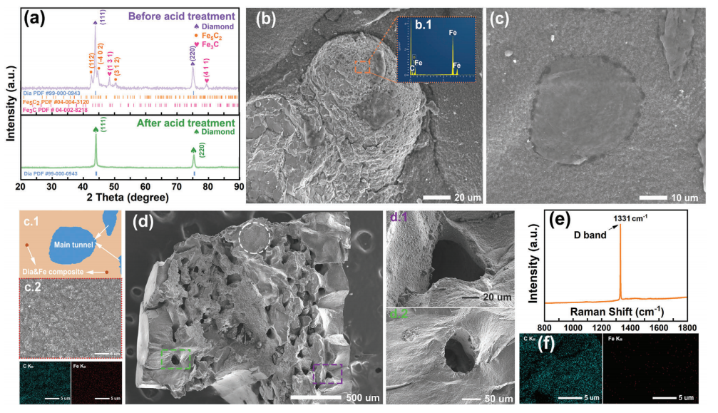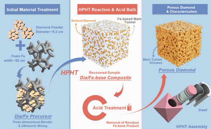 Fe-Ni催化剂在高温高压HPHT条件下展现的共晶特性与泡沫玻璃碳转化为金刚石的启发,李帅錡博士提出一个能够更高效合成多孔金刚石的猜想:在高于共晶温度的金刚石烧结过程中,巧妙运用可溶性骨架作为媒介,并借助化学处理的手段可能获得多孔金刚石结构。因此,该研究结果提出了一种新颖、高效且成本低廉的制造多孔金刚石而不损伤表面的方法,并利用此种可溶性骨架的高温高压法HPHT-ss7 GPa7万个大气压)、1400℃下合成了毫米级多孔金刚石。相关表征显示,该多孔金刚石在维持高硬度(~70 GPa)的同时,具有39.13 m2g-1的比表面积。并且在微米量级(平均75微米)和纳米量级(平均55纳米)上分布着介观尺度的孔结构,这使得它与其他方法合成的金刚石相比具有独特的介孔特性。