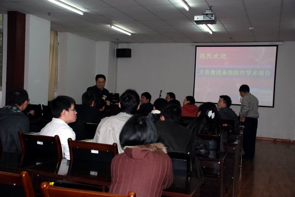 2010 年11月26日 下午4:30,重庆大学博士生导师方亮教授莅临我院,在综合楼二楼会议室作了题为“半导体照明LED工程”的学术报告,还就研究生培养谈了自己的看法,告诫研究生要“仰望天空,脚踏实地”,以深入浅出地演讲风格让在座的同学受益匪浅。学院部分老师、本科生以及全体研究生参加了此次学术报告!