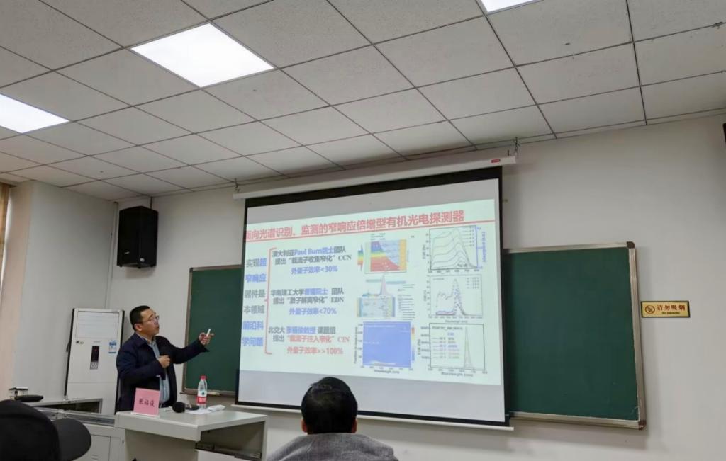 张福俊教授在报告中指出,由于有机材料的激子结合能较大、载流子迁移率低等特点,在有机半导体薄膜中不可能获得过热电子,也就是无法通过碰撞离化、碰撞激发而实现光电倍增,所以传统的有机光电探测器都是二极管型(EQE<100%)。于是张教授团队开始探索基于全新机理的倍增型有机光电探测器。他在报告中介绍了其团队研制的基于单载流子有源层的倍增型有机光电探测器、面向成像的宽响应倍增型有机光电探测器、面向光谱识别与监测的窄响应倍增型有机光电探测器和基于单组分聚合物的倍增型有机光电探测器等研究内容及进展,以及在倍增型有机光电探测器在血氧检测与心率监测、快速光控开关、光脉冲技术和成像方面的应用探索。