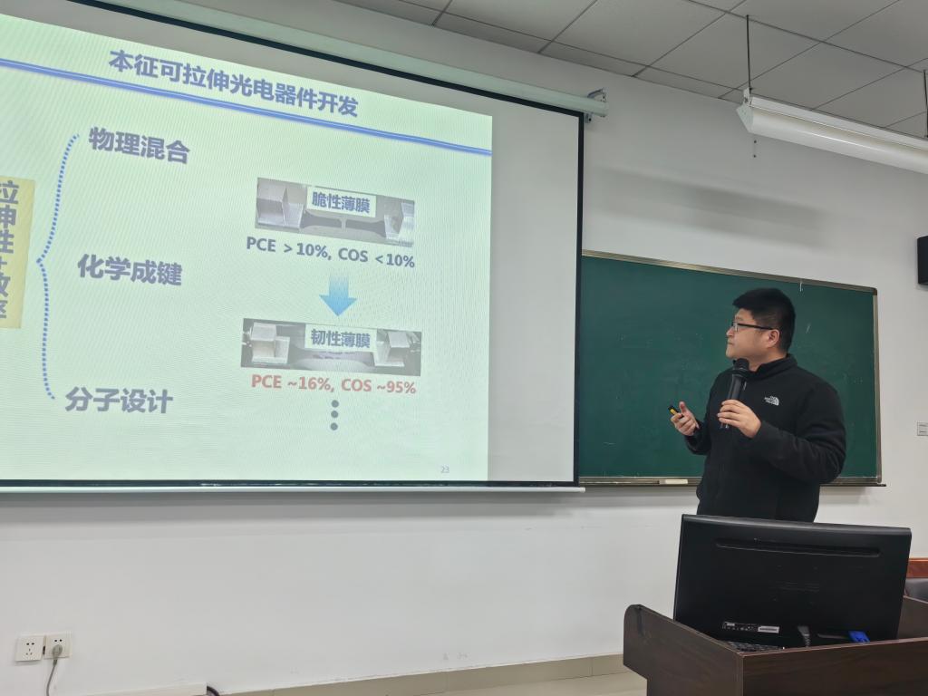在本次报告中,邵教授深入浅出地阐述了新型半导体材料的独特物理性质对光电器件性能和应用的关键作用。他重点介绍了低维有机/无机杂化钙钛矿和有机半导体这两类前沿材料,并展示了它们在光电器件、自旋电子以及柔性可拉伸电子领域的广阔应用前景。邵教授的精彩分享不仅极大地丰富了与会师生的专业知识,更激发了他们对新型光电器件研究的浓厚兴趣与深入思考,为未来的科研工作指明了新的方向,提供了宝贵的灵感。