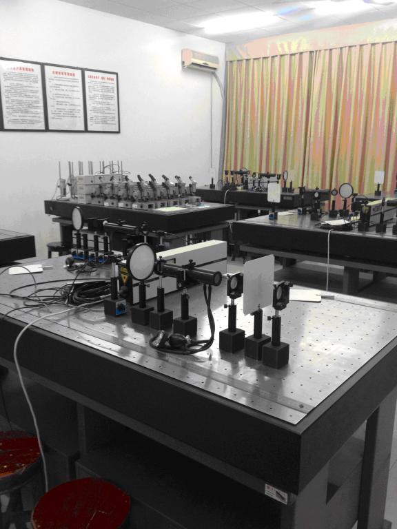 光学实验室,使用面积240m2,主要设备有:防振光学平台、迈克尔逊干涉仪、读数显微镜、分光仪、旋光仪、光具座、气体激光器、固体激光器等。承担物理学(师范)、电子信息科学与技术、科学教育等全校理科专业的光学课程实验教学,同时向全校学生开放。