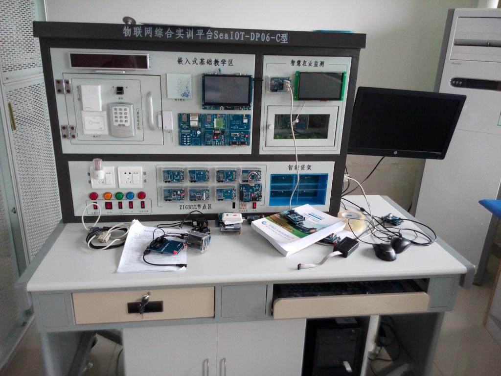 物联网综合实验实训台是根据教育部对高等院校物联网核心课程教学实验大纲的要求,设计研发的面向教学、实验、科研、实训的综合实验平台。六型柜功能是对前期平台功能的再一次提升。平台新增了更多传感器节点、提供了门禁密码系统且有433M/ZigBee网络模块、A8处理器为内核的网关、强电控制模块等硬件资源、智慧农业串口屏显示、控制等,网络协议、数据采集控制程序、网关GUI应用程序、数据库管理程序、网络监控等软件资源,实验指导书提供详细源码,资源丰富,非常适合高校物联网专业教学、实验、实训以及二次开发。